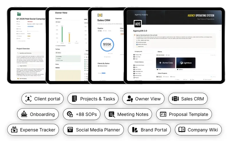 Agency OS works for any service-based business: marketing agencies, design studios, consulting firms, UGC creators, and freelance teams. It's built to be customized for your specific workflow.